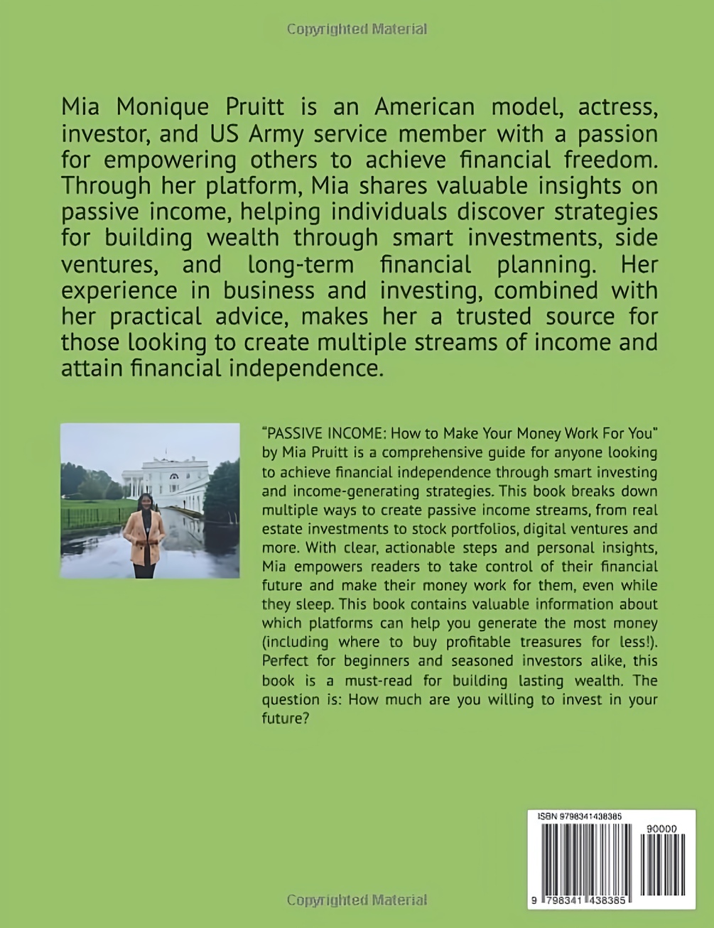 “PASSIVE INCOME: How to Make Your Money Work For You” by Mia Pruitt is a comprehensive guide for anyone looking to achieve financial independence through smart investing and income-generating strategies. This book breaks down multiple ways to create passive income streams, from real estate investments to stock portfolios, digital ventures and more. With clear, actionable steps and personal insights, Mia empowers readers to take control of their financial future and make their money work for them, even while they sleep. This book contains valuable information about which platforms can help you generate the most money (including where to buy profitable treasures for less!). Perfect for beginners and seasoned investors alike, this book is a must-read for building lasting wealth. The question is: How much are you willing to invest in your future?